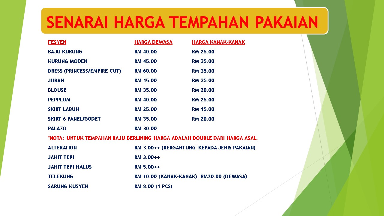 Senarai Harga Tempahan Jahitan Dan Pengubahsuaian