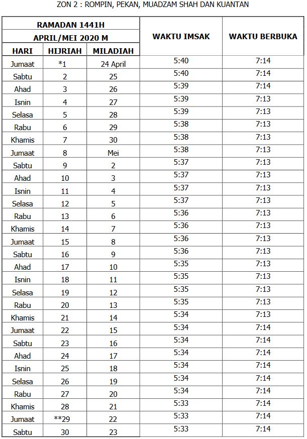 Waktu Berbuka Imsak Seluruh Pahang 2020